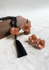 At the heart of this set lies a meticulously handcrafted necklace fashioned from the rich cultural heritage of El Salvador. Crafted from natural seeds sourced from Salvadoran palms, this necklace showcases the elegance of Salvadoran black seeds, locally known as Palmero. Adorned with two crochet medium flowers delicately crafted from upcycled copper wire, and finished with a graceful black tassel, each element tells a story of resilience and renewal.