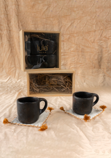 El duo viene cuidadosamente presentado en una caja de madera sostenible con una ventana de vidrio que resalta el elegante diseño de las tazas. Cada pieza refleja la belleza de lo hecho a mano, con un acabado único que hace de este set un regalo corporativo perfecto, fusionando sostenibilidad, comercio justo y un toque de la cultura salvadoreña.