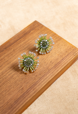 The Clover Glow Studs are a radiant blend of tradition and modern elegance. Featuring a delicately embroidered centersurrounded by shimmering crystal beads, these unique handcrafted earrings capture the charm of clover blossoms in bloom. Their circular design, with soft olive and green tones, creates the perfect balance between chic modern earringsand timeless artisan craftsmanship.