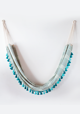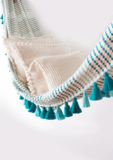 Our handwoven hammocks are meticulously crafted on traditional lever looms using natural cotton threads. The result? A stunning white base adorned with exquisite degraded chain design stripes and 80 beautifully degraded colored tassels on the sides. Available in soothing blue tones and refreshing turquoise hues.