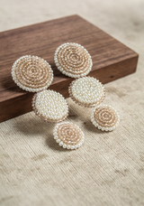 Each earring features a mesmerizing composition: the first and last circles adorned with shimmering crystals and lustrous pearls, reminiscent of glistening sea foam around the shore, while the central circle boasts an inverted arrangement, showcasing a symphony of pearls and crystals that mirror the depth and beauty of the sea.