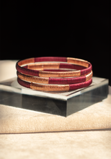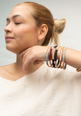Luce segura y sofisticada con este brazalete únicos de cobre decorado con vibrantes franjas de hilo en tonos burdeos, verde oliva, negro, gris claro y verde. Elaborado a mano por talentosas mujeres artesanas en El Salvador, cada pieza cuenta una historia de creatividad, empoderamiento y comercio justo.