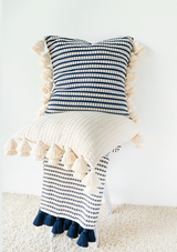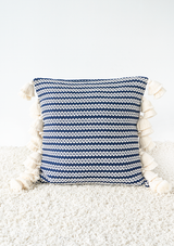 Elevate your space with the Handwoven Flower Chain Pillow Cover, crafted by artisans in El Salvador. Featuring a rich navy blue base and an elegant chain-flower pattern in white, this 19x19" pillow cover blends timeless style with ethical craftsmanship.