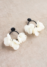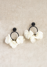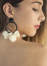 These eco-friendly fashion earrings showcase a captivating composition – a circle adorned with hand-embroidered black crystals followed by a crystal-studded ring, culminating in a cascade of delicate fish scales suspended.