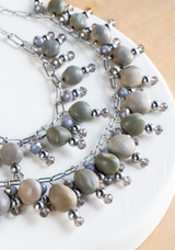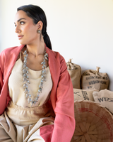 Handmade in El Salvador by empowered women artisans, this elegant piece blends natural seeds, smoky crystals, and silver accents. Rooted in sustainable fashion, it reflects eco-luxury design and honors ancestral wisdom through fair trade craftsmanship.